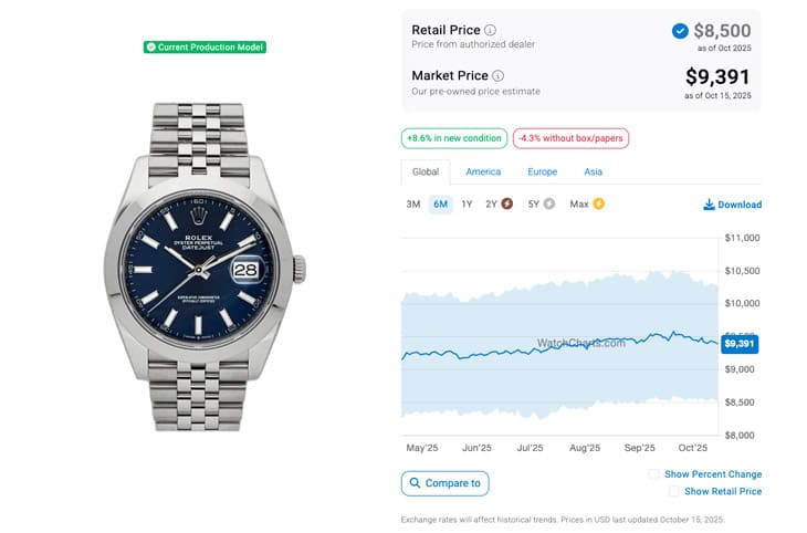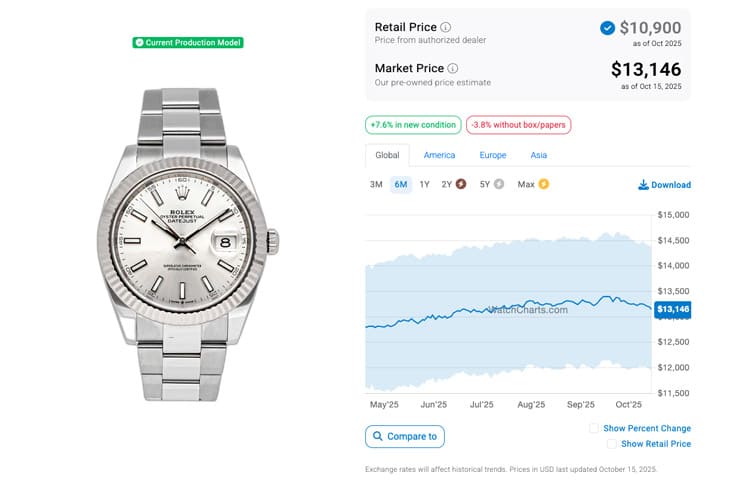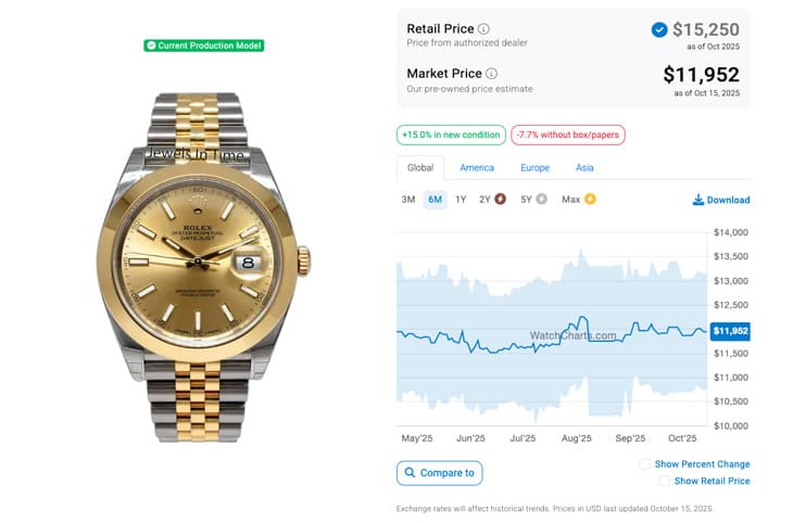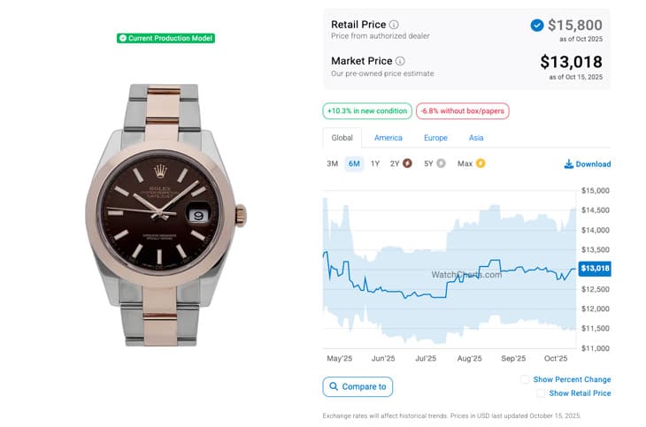 根據高級手錶市場調查研究機構WatchCharts的資料,Datejust 41系列各款式(就以上面提到的五款為例)在國外二級市場的報價在2025年4月時分別是126300-0002(不鏽鋼、拋光錶圈、五珠帶)的9,158美金(約合台幣28萬)、126334-0003(白金鋼、坑紋錶圈、三板帶)的12,802美金(約合台幣39萬2)、126301-0001(永恒玫瑰金鋼、拋光錶圈、三板帶)的13,301美金(約合台幣40萬7)、126303-0010(黃金鋼、拋光錶圈、五珠帶)的11,952美金(約合台幣36萬6),還有126333-0012的14,100美金(約合台幣43萬2),大致上手錶的保值性都還可以,其中有兩款呈現超定價情況。