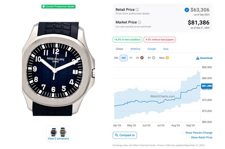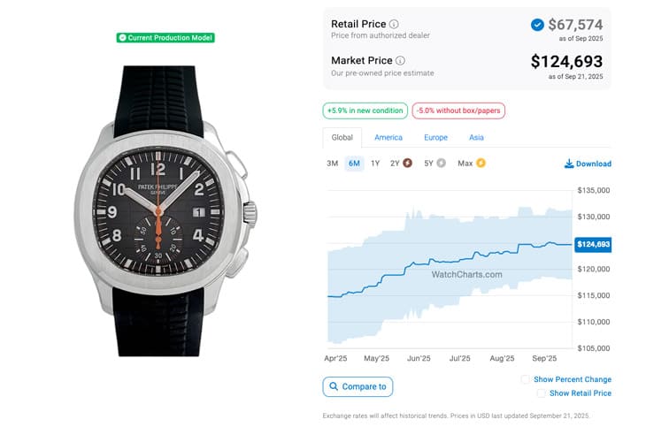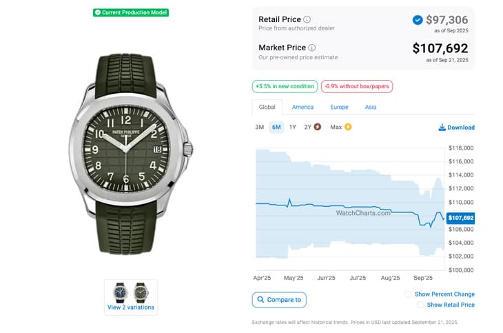 根據高級手錶市場調查研究機構WatchCharts的資料,上述Aquanaut系列人氣作品的二級市場行情在2025年3月左右分別是5167A:51,604美金(約合台幣156萬6)、5167R:71,154美金(約合台幣216萬)、5168G-001:72,330美金(約合台幣219萬5)、5968A:114,827美金(約合台幣348萬5)和5968G-010:109,805美金(約合台幣333萬3),每一款比起定價都高滿多的,由此可知在2022年第一季尾聲時手錶行情曾經衝到的巔峰狀態有多驚人,使它們經歷三年來的價格下滑期之後,超定價情況還是顯而易見。