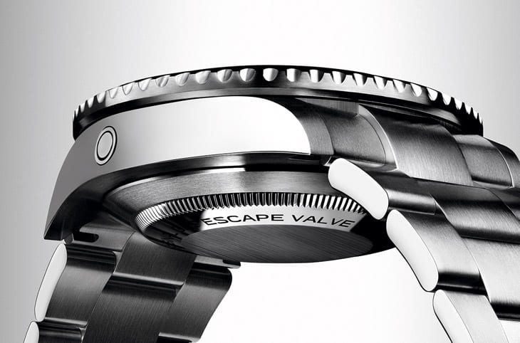 ▲排氦閥是區隔海使和水鬼最容易分辨的元素。比起為了要達到3,900米的防水深度而加裝了眾多強化結構的Deepsea,海使的錶徑雖然也不。穸纫詫I運動錶而言還可以接受。