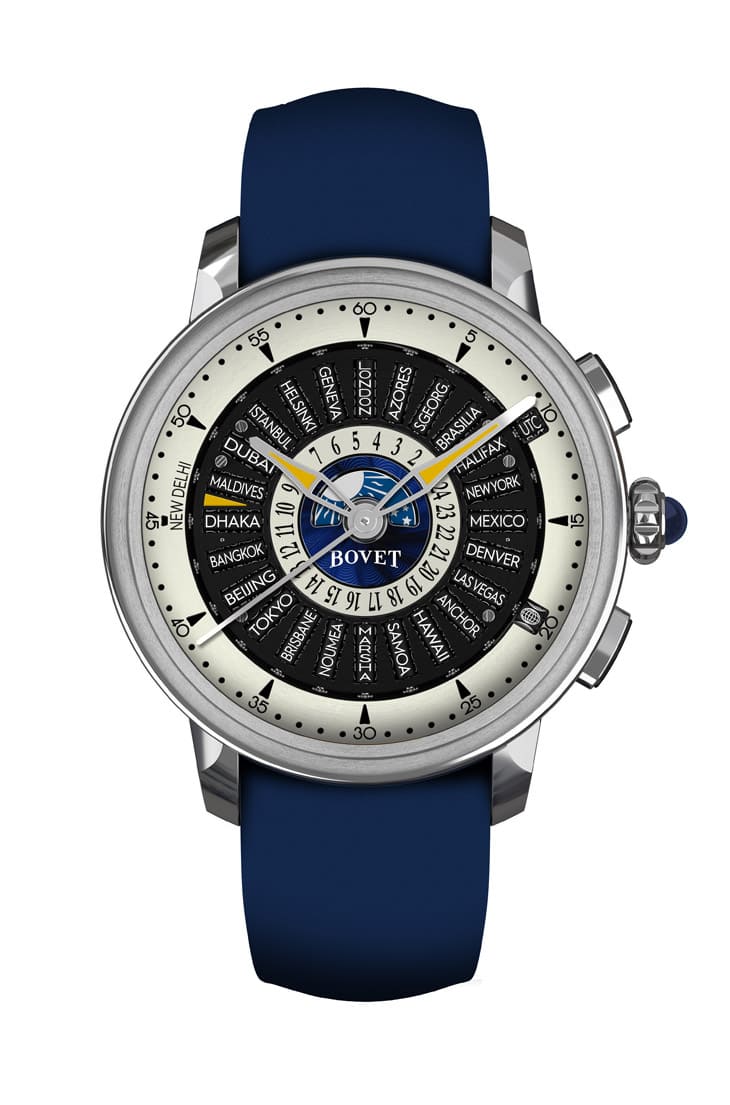 另一款值得注意的是Récital 27三地時間手錶,它不只講求實用性,也在設計上呼應播威的歷史,其三個時區的設計正是要向BOVET早期在瑞士、倫敦與中國的商業活動致敬。這款錶沒有使用他們過去常見的鏤空設計,而是回歸較樸實的「蓮花」圖案機刻雕花主視覺,讓整體更清楚易讀且富有視覺魅力,令人驚豔的是,手錶每個時區也都會加上日夜指示器與可客製的城市名稱,對使用者來說彈性相當高。