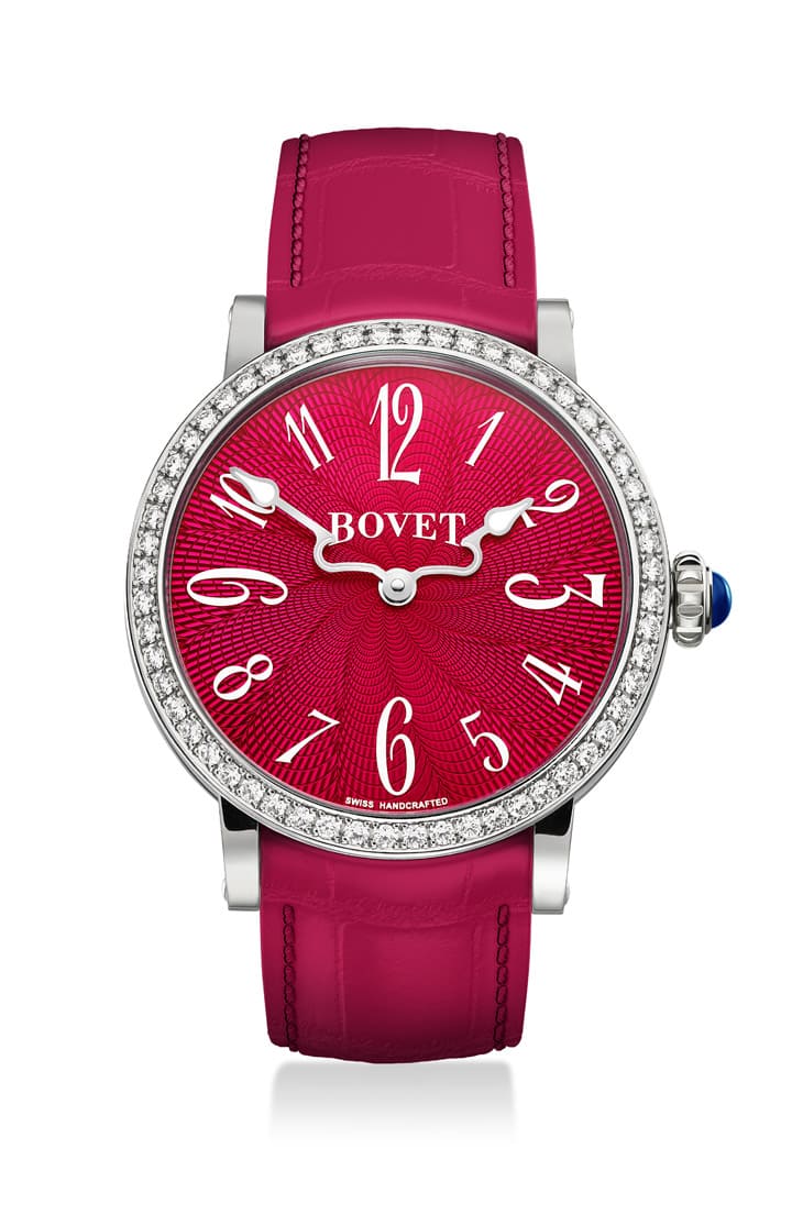 至於比較偏向女性市場的Récital 12 36mm手錶同樣很有料,播威試圖用輕盈的方式詮釋高級製錶,這款以不鏽鋼材質打造,搭配鑽石錶圈,有著綠松石色或覆盆子紅色漆面機刻雕花面盤堆砌的亮眼外型,面盤上還有「蓮花」造型的指針設計,也讓它帶有一點詩意,BOVET甚至設計出鍊帶快拆機制,賦予佩戴和穿搭時的靈活性。這款錶的錶背鍍金工藝靈感來自品牌珍藏的傳家懷錶,低調展現深厚歷史底蘊,內部自動上鍊機芯能提供42小時動能。