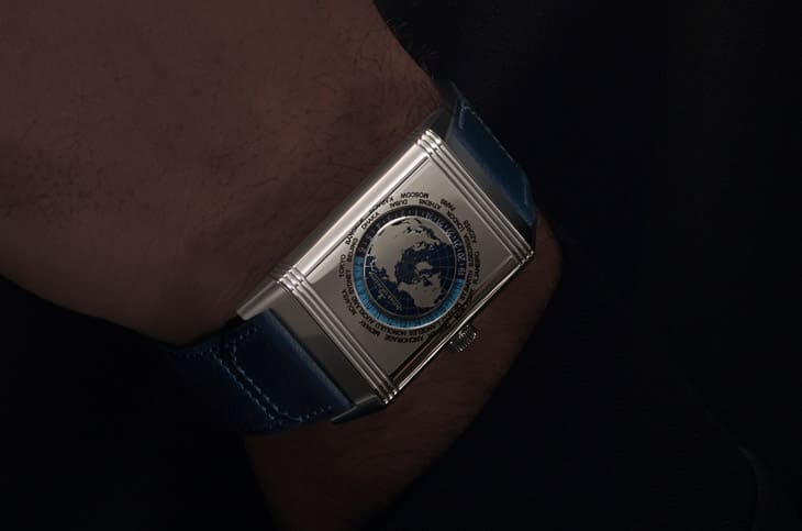 ▲錶殼尺寸為49.4×29.9×11.14mm,雖屬大型Reverso,卻仍纖薄貼腕,如此加大的尺寸考量也是為確保世界時區顯示清晰且實用。