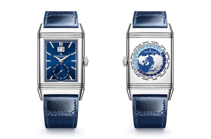 這款Reverso Tribute Geographic在設計上保留了Reverso最重要的視覺特徵,包括長方形錶殼、凹槽裝飾、太子妃指針、小秒盤與太陽放射飾紋,但同時又給它加入現代感十足的世界地圖和大日期顯示。整體比例與配色,以不鏽鋼款式而言如正面深藍、背面淺藍與海軍藍交織,讓人一眼看出這不是舊作,而是一個穿越時間的革新。手錶49.4x29.9mm的尺寸比一般Reverso更大點,但這是為了讓世界地圖與城市名稱的細節得以清晰展現的必要變革,由於積家把厚度控制得宜,加上弧形錶耳與略帶彎度的錶殼,它在手腕上的服貼度與舒適度依然相當優秀。還有一點值得一提,不鏽鋼版本隨錶附上兩條Casa Fagliano設計的錶帶,一條是藍色帆布拼小牛皮,另一條是純藍小牛皮,佩戴者可以依照場合或穿搭自由變換風格。