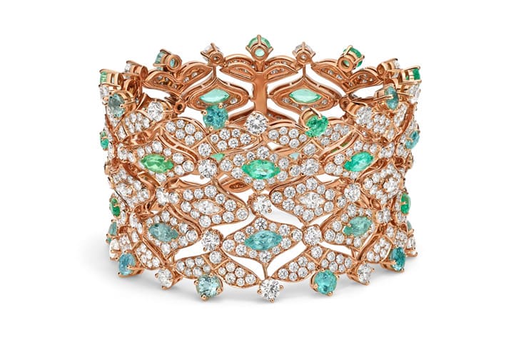 ▲Mediterranea系列Paraiba Tourmaline Mosaic頂級玫瑰金帕拉伊巴碧璽與鑽石手環。