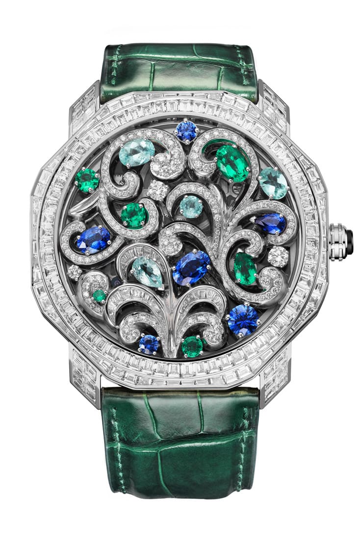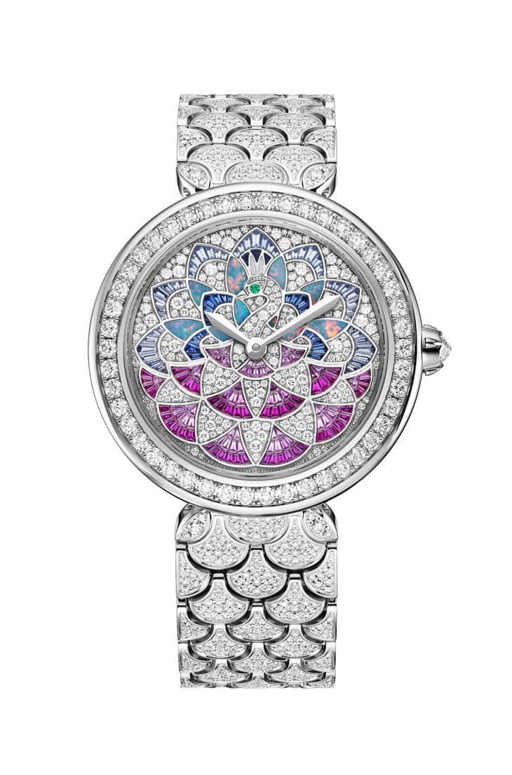 18K白金材質/BVL 191自動上鍊機芯/時、分顯示/錶款鑲鑽/面盤鑲長棍形切割藍色和粉紅色藍寶石、圓形明亮切割鑽石、圓形切割混合祖母綠、蛋白石/藍寶石水晶鏡面/防水30米/錶徑37mm/限量10只