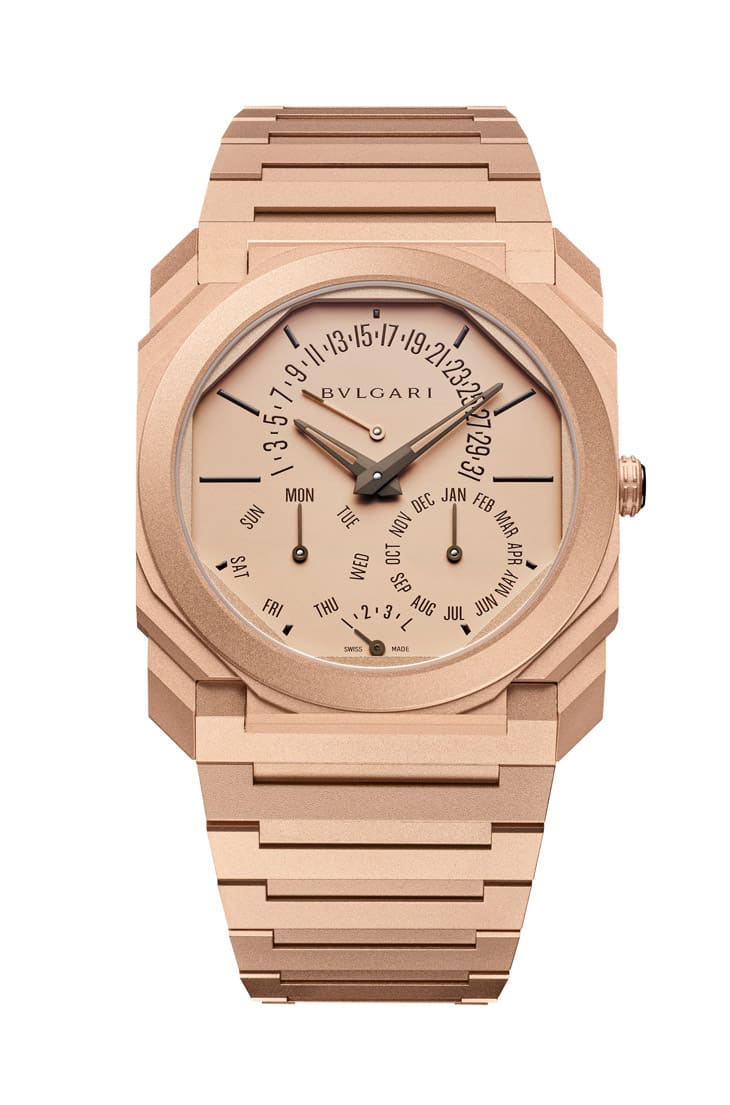 複雜功能方面,寶格麗這次也沒忽略。Octo Roma Striking Papillon Tourbillon搭載中置飛行陀飛輪與獨特的「蝴蝶式」分鐘顯示設計,讓時間閱讀變得詩意又新鮮,而另一款Octo Finissimo Perpetual Calendar玫瑰金款,更是超薄萬年曆腕錶的典範,自製BVL 305機芯厚度僅2.75mm,卻能兼容逆跳日期、閏年、星期與月份等功能,60小時動力儲存也相當實用。這些都證明寶格麗在技術上的硬實力毫不含糊。