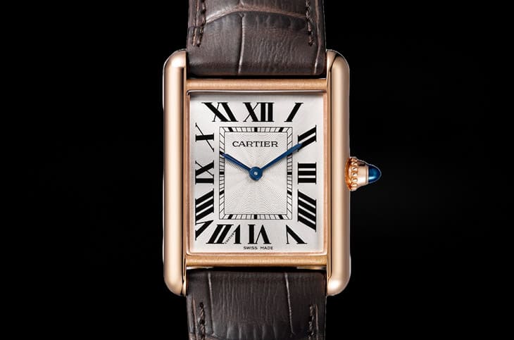 ▲玫瑰金長方形錶殼搭配棕色鱷魚皮錶帶,並有藍鋼指針與藍寶石錶冠點綴,搭載手動上鍊機芯並具30米防水功能,是卡地亞優雅代表作。