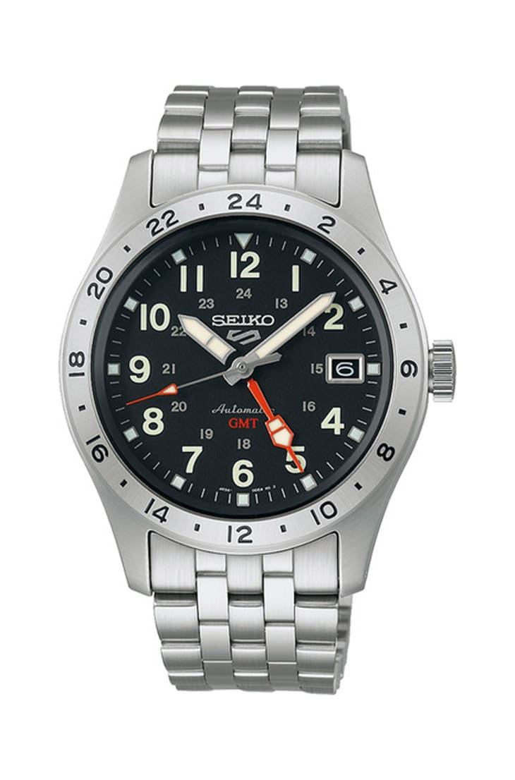 以不鏽鋼材質打造42.5mm「龜殼」形錶殼,四點鐘位置旋入式錶冠是系列經典特徵,最具辨識度的是它的雙色灰黑24小時旋轉錶圈,搭配深紅GMT指針,在黑色面盤上對比鮮明,實用與玩味兼具,圓點與棒狀時標塗覆強力夜光塗層,黑暗環境中讀時無礙。內置4R34自動機芯,功能完整,並具100米防水性能。五鍊節鍊帶耐用舒適,適合旅行、日常與休閒場景。價格也是台幣一萬出頭,親民又實用,成為玩家入手GMT的高CP值選擇,也讓SEIKO 5系列持續站穩暢銷榜。