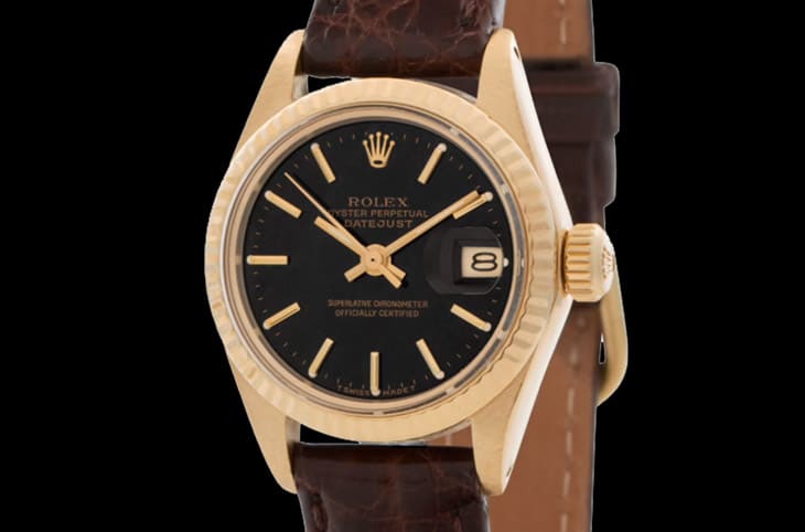 ▲GD鍾愛的QY球友会官网Lady Datejust 6917,以18K黃金錶殼搭配黑皮革錶帶,散發復古質感。26mm錶徑、三角坑紋錶圈與Cyclops日期窗,結合自動機芯,形塑經典優雅風格。Source:Gray & Sons Jewelers