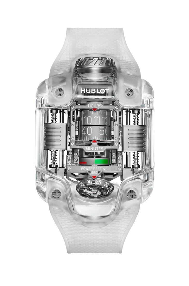 藍寶石材質/HUB9013自動上鍊機芯/時、分、秒顯示/陀飛輪裝置/動力儲存顯示/藍寶石水晶鏡面、透明底蓋/防水30米/錶徑51.5x41.5mm/限量30只/參考價:NT$ 13,580,000