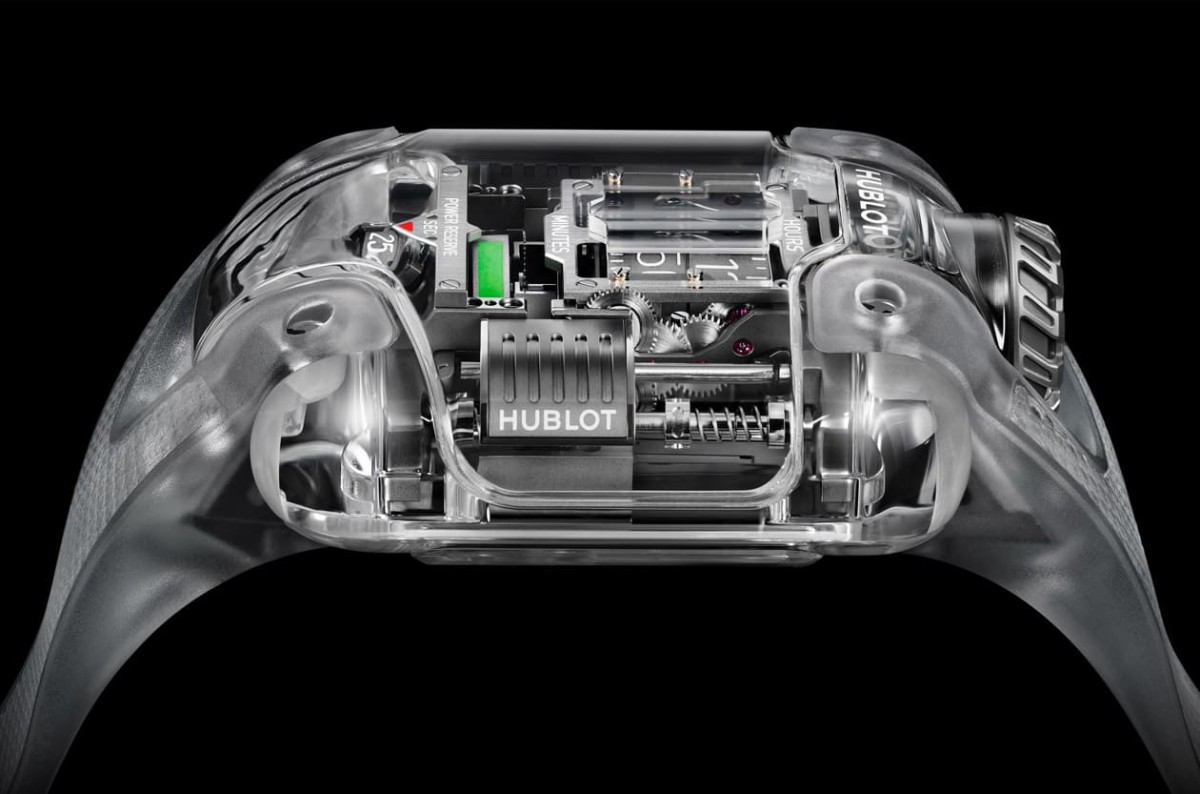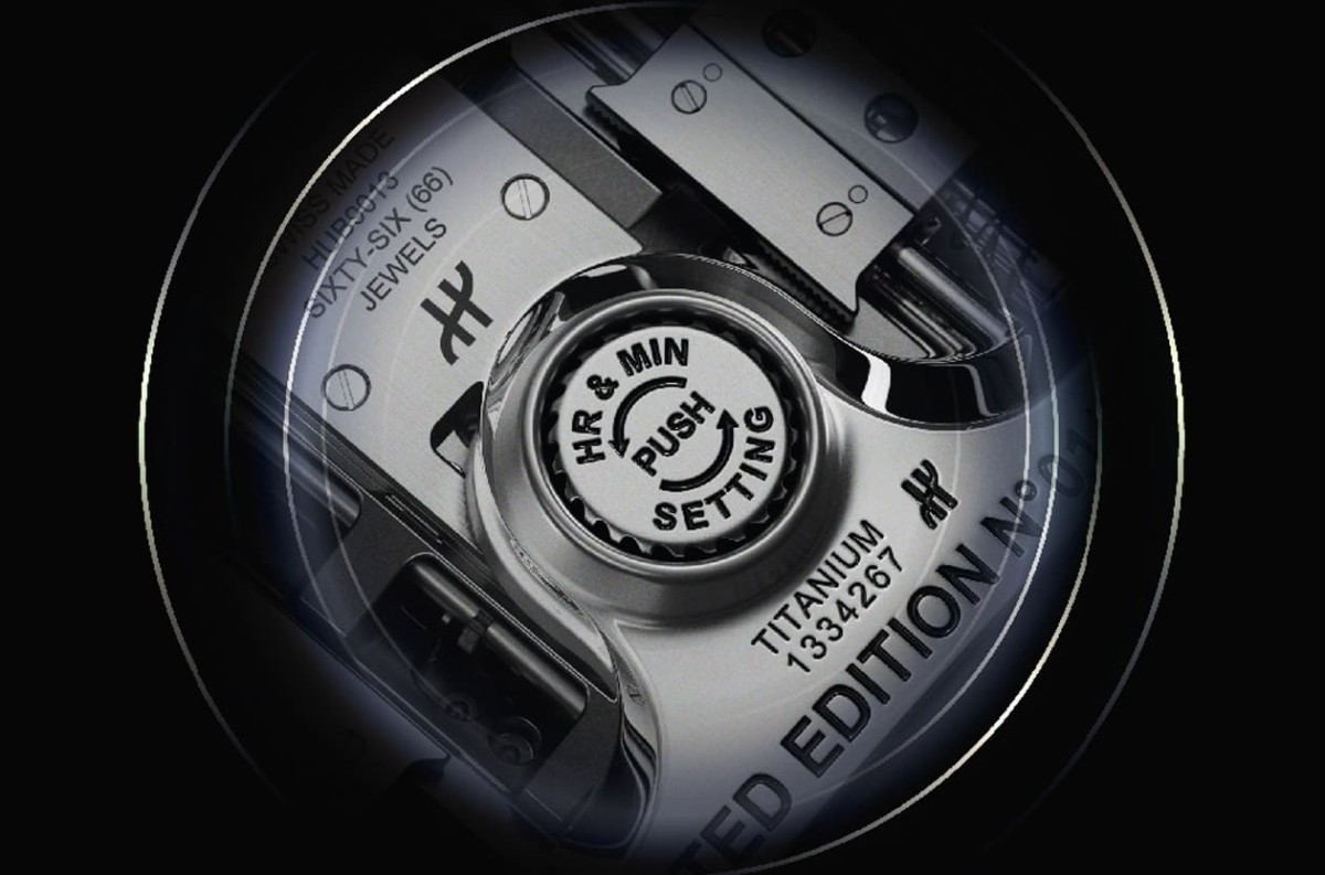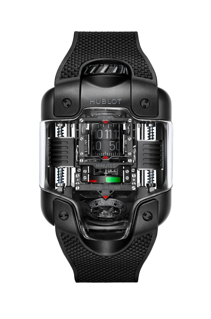 ▲腕錶搭載HUB9013機芯,由592枚零件與66顆寶石組成,垂直設計如變速箱般精密,驅動、顯示與調速系統完美整合,工程密度媲美賽車引擎。