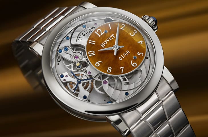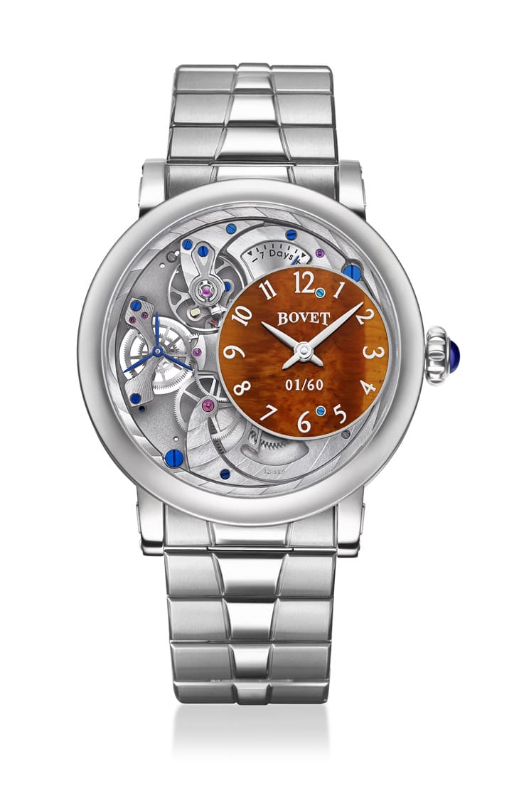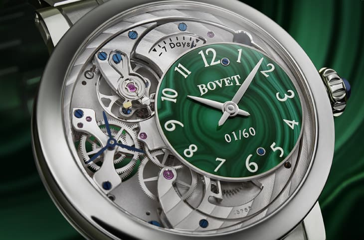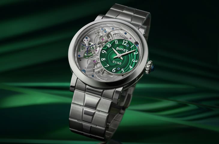BOVET向來以複雜功能與精細飾面聞名,而Récital 12系列則帶來更親近日常的運動感設計,2025年,播威針對該系列推出兩款全新限量手錶,分別以孔雀石與虎眼石打造面盤,為系列注入自然靈氣,這是播威首次將天然寶石融入 Récital 12,展示對細節與材質的敏銳洞察。