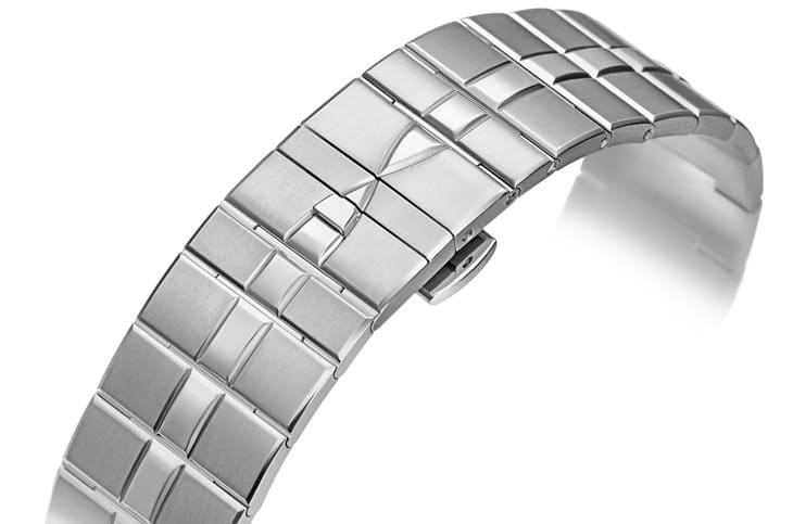 ▲鈦金屬鍊帶搭配蝴蝶式錶扣,閉合時V形鍊節形成無限符號象徵永恆,設計巧思十足。