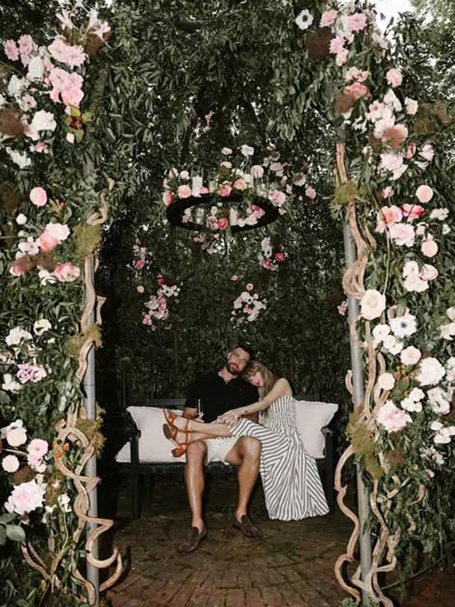 ▲求婚現場充滿浪漫氛圍,特拉維斯單膝跪地,泰勒絲含笑點頭,隨後釋出的甜蜜合照,被花朵與綠意包圍,洋溢幸福喜悅。Source:Instagram @taylorswift