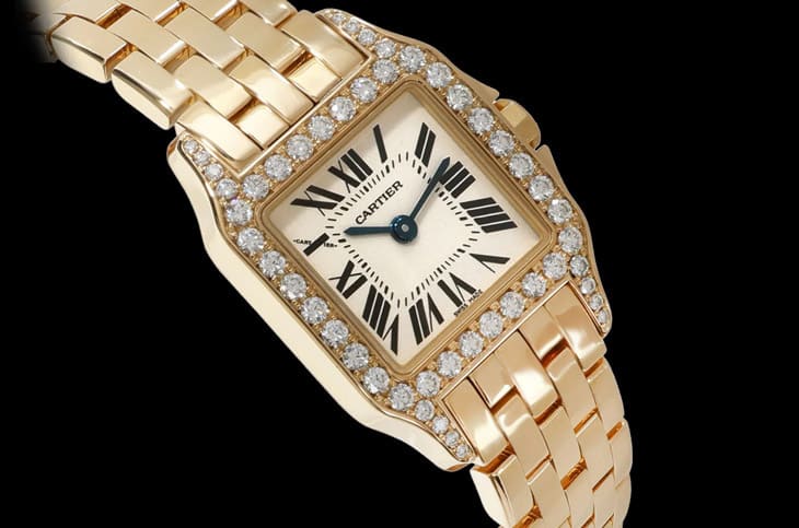 ▲Santos Demoiselle以18K黃金打造,尺寸僅20x20mm,精緻鑲嵌明亮式切割鑽石,甚至錶冠亦鑲鑽,散發內斂卻又華麗的氣息。Source:myGemma