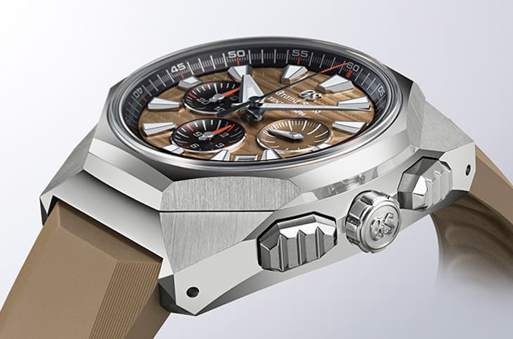 ▲棕色「獅子鬃毛」紋理自然生動,水平紋路層次分明。Evolution 9式的大指針與立體時標填充夜光,搭配嵌入式小錶盤,資訊清晰易讀,兼具美感與實用性。