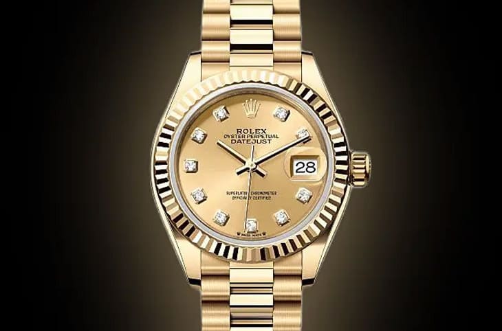 ▲這款18K黃金Lady-Datejust具28mm錶殼、鑲鑽香檳面盤與元首型鍊帶,搭載2236機芯,兼具精準、奢華與收藏價值。