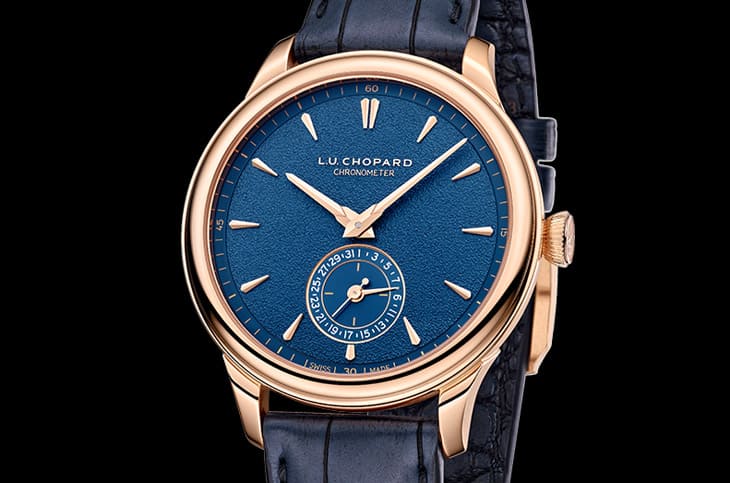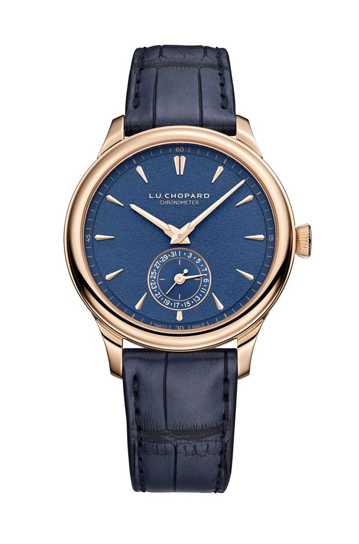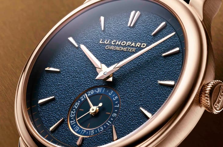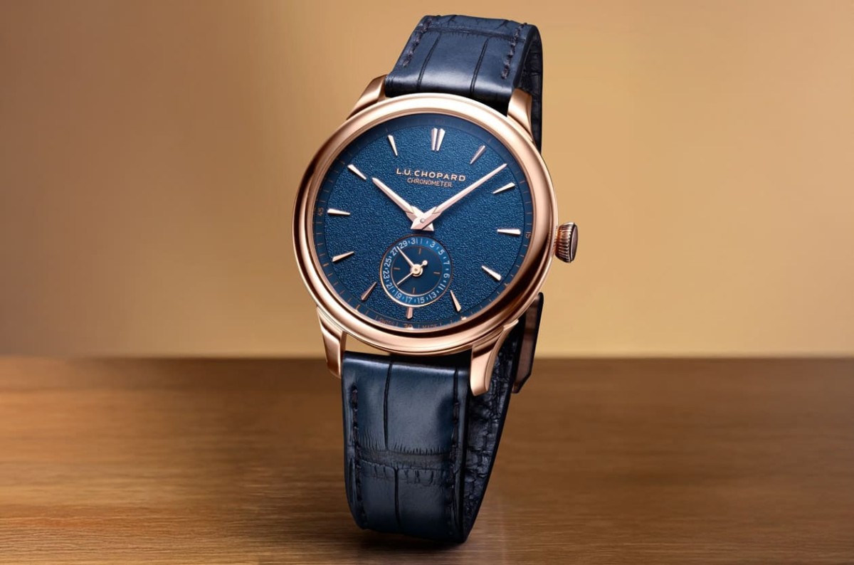面盤可說是這款25週年紀念版最令人眼前一亮的地方,蕭邦選擇了電鍍深藍色的黃銅材質,並施以霧面粒紋處理,讓藍色看起來不浮誇,反而呈現深邃與沉穩,當玫瑰金指針與時標映照其上時,對比效果極為鮮明,既優雅又富現代感;與過往版本相比,這次在設計上做了大幅度的簡化,動力儲備顯示被移除出面盤,轉而安置在機芯背面,這一巧思使得整體視覺更純粹,並將焦點集中在時間本身,6點鐘方向的下陷小錶盤,則同時兼具小秒針與指針式日期顯示功能,這個設計不僅實用,其裝飾細節也相當講究:中央蝸形紋搭配外圈拉絲處理,中間以倒角分隔,細膩而立體。L.U.C Quattro手錶的面盤設計,正好展現了「少即是多」的哲學,它不追求滿版的複雜感,而是以極簡線條與精緻細節達到高級感,將藍與金的組合,轉化為雋永的視覺體驗。