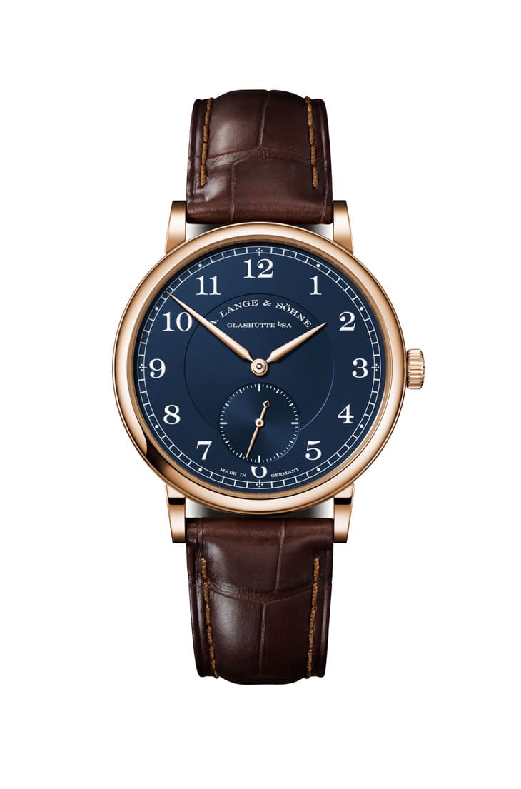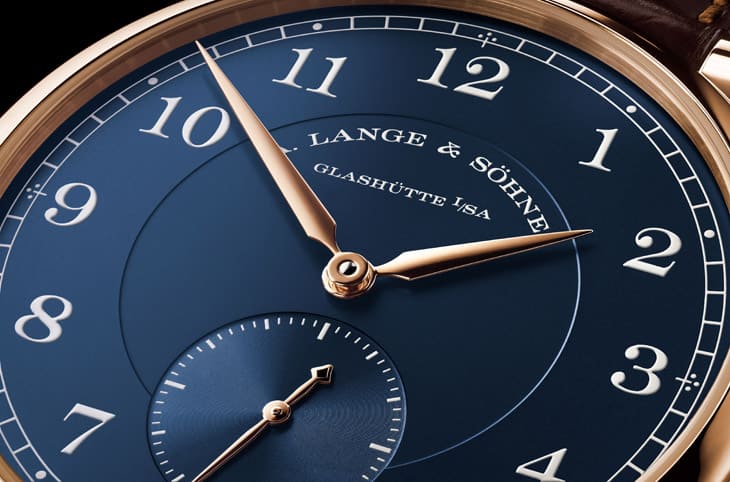 第一眼看過去,你會看到一枚藍色調的面盤,它的基底其實是925銀,經過電鍍處理後呈現深邃的藍色,這樣的色調在朗格手錶中並不常見,多半出現在特別款或限量版上,因此顯得格外矚目。面盤的結構靈感源自朗格早期懷錶:中央略微凹陷,邊緣則以細緻的階梯分層帶來立體感,軌道式分鐘刻度環繞外圈,這是1815系列最鮮明的符號,讓人一眼就很容易辨認,時標選用阿拉伯數字,字體厚實而帶襯線,既經典又多了幾分休閒味道。6點鐘方向的小秒盤則是亮點之一,它以蝸形紋裝飾,低調卻能在光線下呈現細膩變化,同時還具備玫瑰金質感點綴,呼應外殼材質。至於指針,則是1815家族的招牌——葉形(Lancet)設計,修長的分針能精準觸及刻度邊緣,讓讀時一目了然,可以說面盤設計沒有多餘裝飾,但卻能在簡約中流露層次,這就是朗格的拿手好戲。