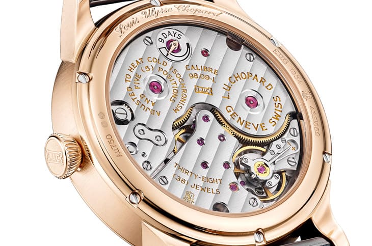18K玫瑰金材質/L.U.C 98.09-L手動上鍊機芯/時、分、小秒、日期顯示/藍寶石水晶鏡面、透明底蓋/防水30米/錶徑39mm