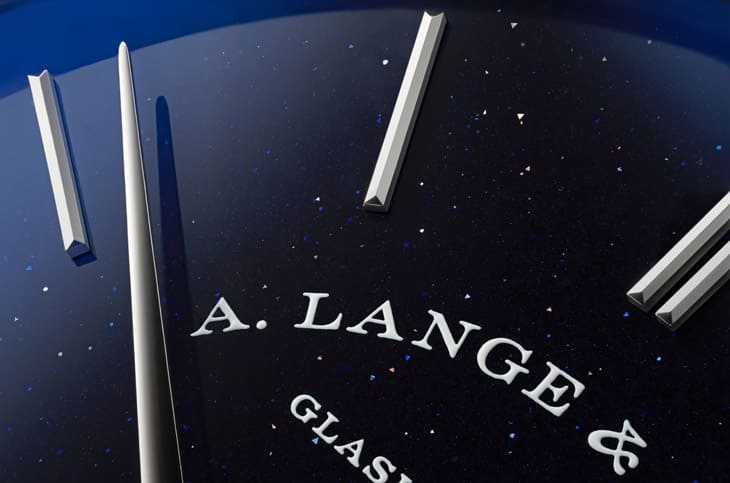 另一種材質是砂金石玻璃(Aventurine Glass),事實上它並非天然礦石,而是一種自17世紀威尼斯傳承下來的玻璃工藝,工藝師會在熔融玻璃中注入銅顆粒,隨著火焰逐漸減弱,顆粒形成微小晶體,最終在玻璃中呈現閃爍效果,當這層纖薄玻璃附著於實心銀面盤上,會營造出如夜空般的星點閃光。朗格將砂金石玻璃應用於Saxonia Thin與Little Lange 1 Moon Phase等作品上,使手錶呈現出極具詩意的視覺效果。