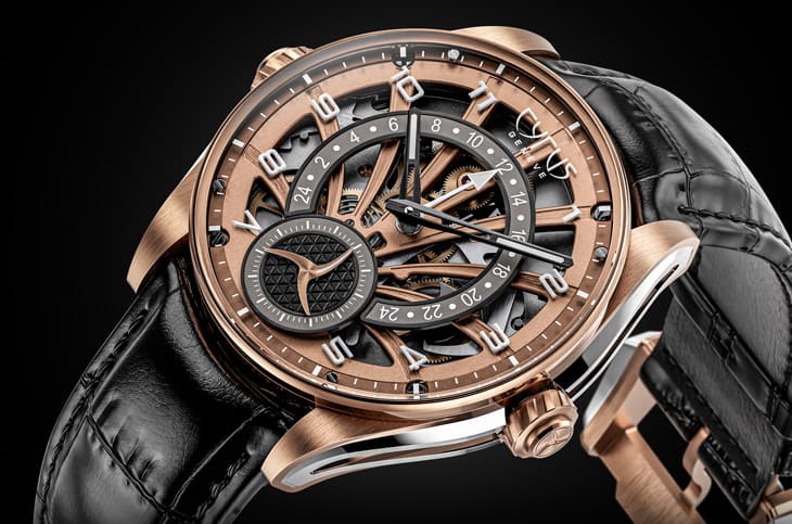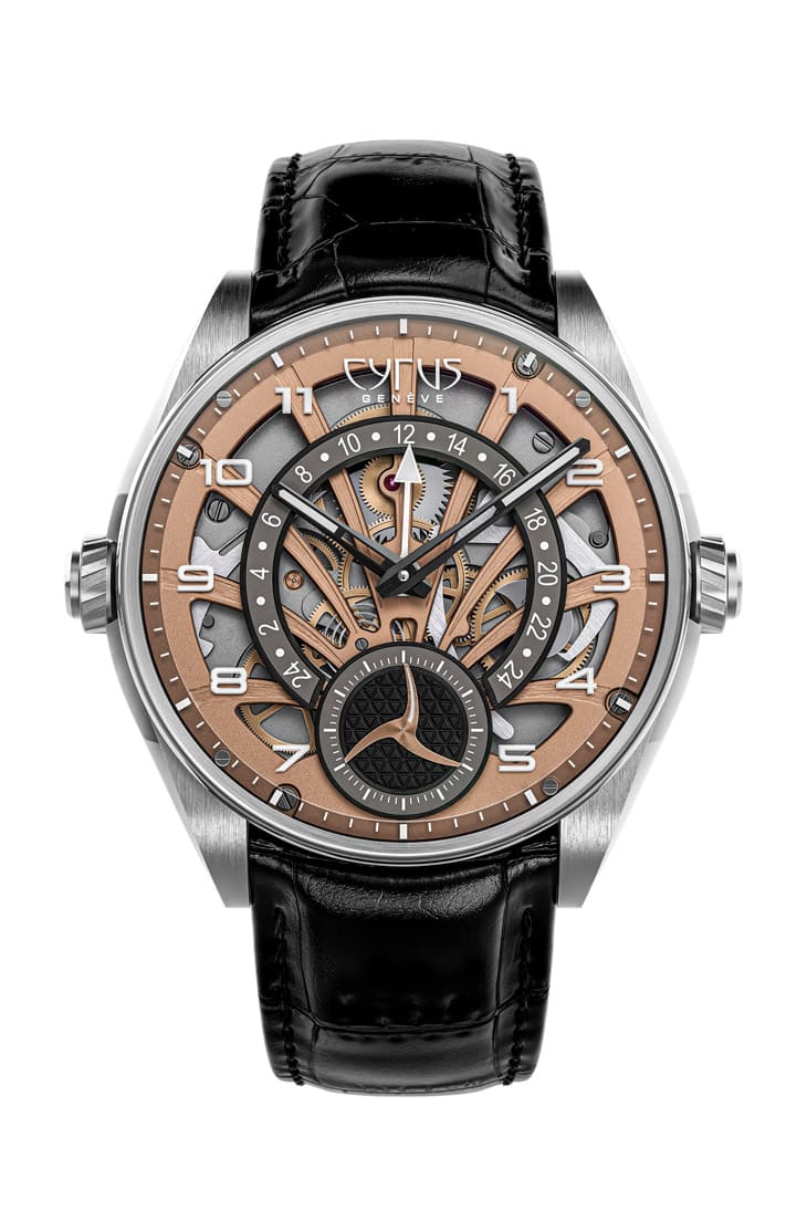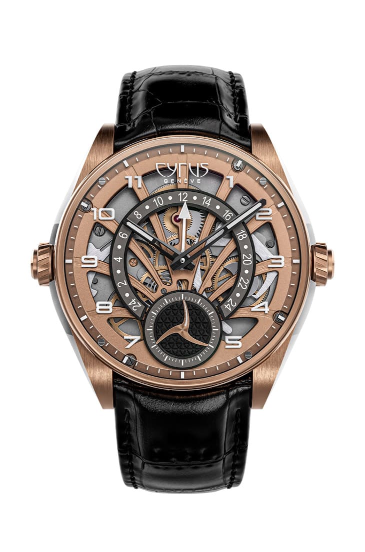 Dominion GMT的面盤設計層次豐富,中央鏤空時分指針顯示所在地時間,第二地時間透過逆跳指針搭配24小時弧形刻度呈現,面盤上層的機芯橋板靈感源自棕櫚樹造型,採用玫瑰金色系鍍層,橫跨面盤如雕塑般展示逆跳系統與齒輪運作。手錶搭載CYR708製自動上鍊機芯,由278枚零件組成,靠著單一發條盒提供55小時動力儲存,震頻4Hz,藍寶石底蓋展現經NAC(黑銠)處理的橋板,結合弧形太陽放射紋、霧面噴砂及拉絲交錯修飾,每個細節都清晰可見。