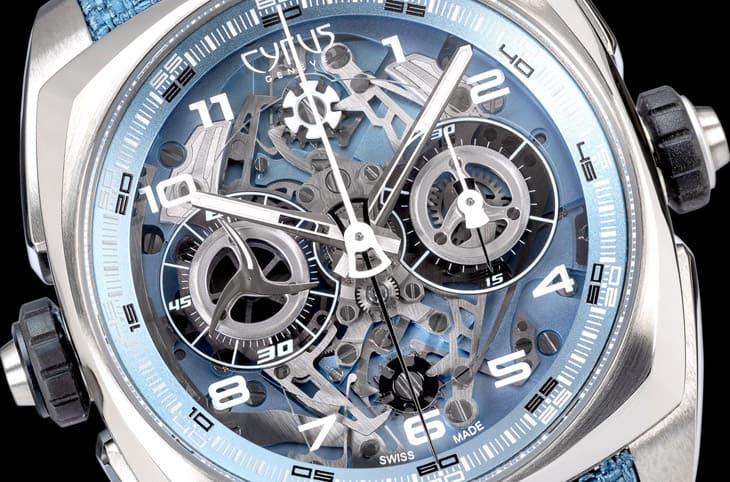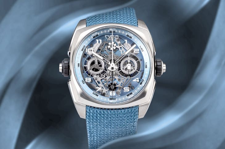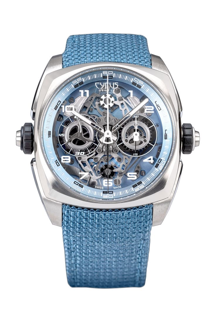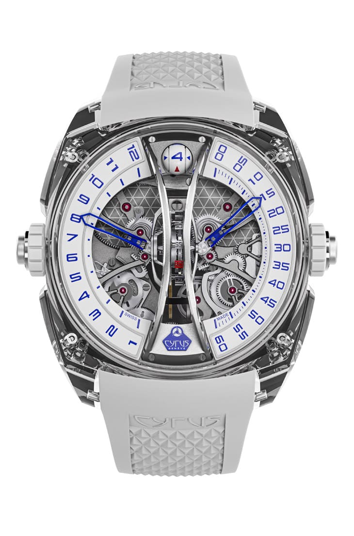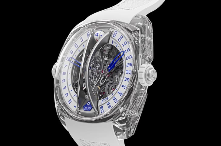 CYRUS的頂級製錶代表作,還包括Klepcys Vertical Tourbillon Sapphire Blue垂直鏤空藍寶石陀飛輪,全球僅8只,藍寶石水晶錶殼結合18K白金細節與電光藍色,呈現未來感氛圍,延續Klepcys系列枕形錶殼,採用莫氏硬度9級藍寶石水晶,製作超過150小時,光影間呈現雕塑般立體效果。