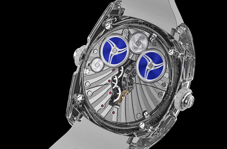 藍寶石材質/CYR625手動上鍊機芯/逆跳時、逆跳分、秒顯示/陀飛輪裝置/動力儲存顯示/藍寶石水晶鏡面、透明底蓋/防水30米/錶徑44mm/限量8只/參考價:NT$ 10,580,000