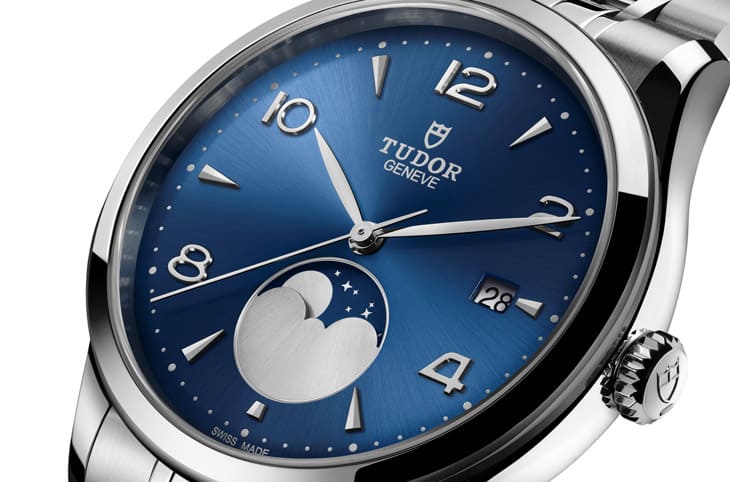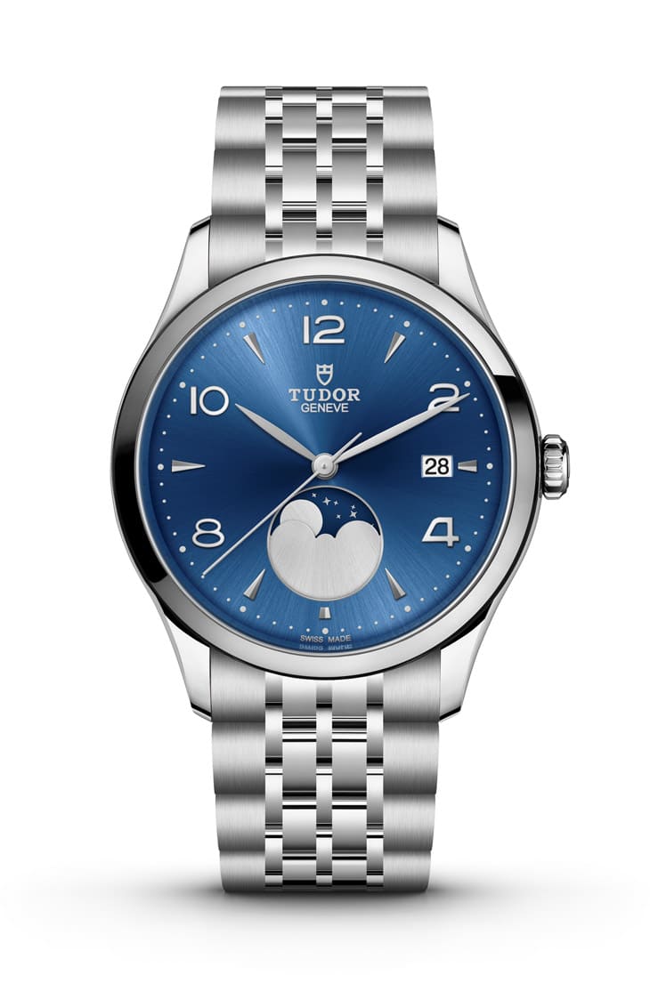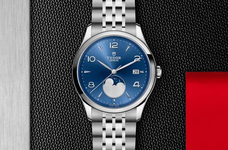 不同於之前1926系列的壓紋圖案,這次改用放射狀太陽紋藍色面盤,細膩的光線流動感讓整只錶顯得更加現代,尤其藍色在帝舵的語言中象徵典雅與穩重,配合輕微弧形的藍寶石水晶鏡面,整體視覺既柔和又富深度,時標以銀色鑲嵌方式呈現,並用阿拉伯數字與條狀交錯配置,構築出均衡的視覺節奏。劍形指針線條乾淨俐落,未覆夜光塗料,呼應正裝錶的純粹美感。6點鐘位置的月相盤以銀白月亮與深藍夜空描繪月盈月缺,搭配3點鐘的日期窗,兼具實用與裝飾功能,雖有錶迷對於機芯尺寸略小導致日期窗與月相盤位置略顯集中提出意見,但對多數佩戴者而言,這樣的佈局能讓視覺焦點更聚於月相本身,一個會隨時間變化的細節,讓這只手錶多了情感溫度與觀賞價值。