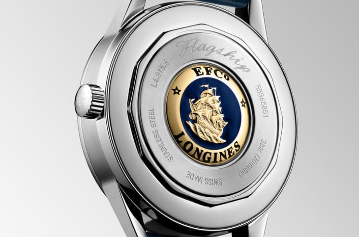 Flagship Heritage月相錶採用拋光不鏽鋼打造,直徑38.5mm,這個尺寸戴在手上剛剛好,12.4mm的厚度雖稍顯厚實,但也讓整只錶更具份量感,浪琴表在造型上巧妙融合了現代線條與復古輪廓,從弧形錶耳到低調的圓形錶冠,都散發著1950年代的紳士氣息。錶殼的打磨是亮點之一,錶耳外緣以細緻倒角處理,拋光面與拉絲面交錯,讓光線在不同角度下產生微妙變化,這樣的對比細節,不僅讓錶殼顯得更纖細,也提升了整體精緻度。最具辨識度的設計藏在錶背,有一枚18K金打造、手繪琺瑯的帆船徽章,象徵著Flagship之名的真正精神,船隻正揚帆遠航,寓意力量與穩定,這個傳承自1950年代的標誌設計,至今仍是收藏家辨認浪琴表經典正裝錶的關鍵符號。