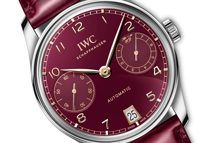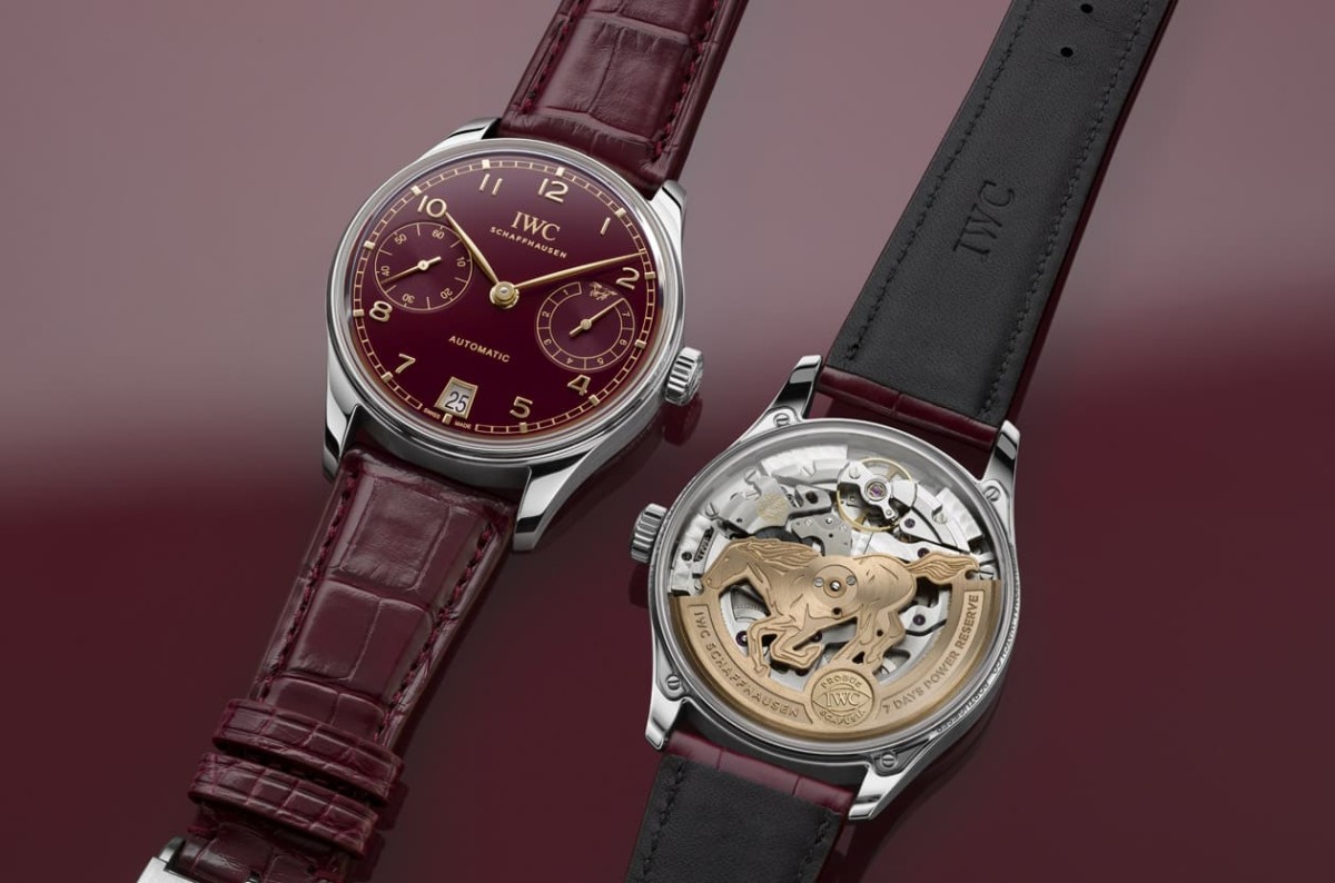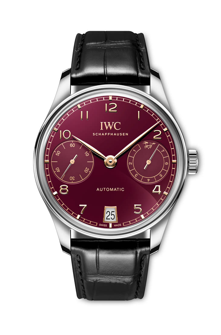 手錶採用直徑42.4mm不鏽鋼錶殼,側面輪廓更顯纖長,搭配前後Box式藍寶石水晶,呈現精緻而優雅的外觀。錶殼防水性能達到50米,日常佩戴無虞。面盤採用酒紅色調,呼應農曆新年的喜慶色彩,同時展現葡萄牙系列標誌性的對稱美學,金色指針搭配阿拉伯數字時標,提供清晰閱讀的同時,增添俐落明快氣息,面盤佈局維持經典設計:9點鐘位置設有小秒針,3點鐘位置為動力儲存顯示,6點鐘則是低調的日期視窗,兼具實用與美感。