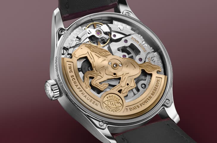 在機芯部分,手錶搭載52011自動上鍊機芯,每小時震動28,800次,內含31顆寶石,其具備IWC著名的比勒頓上鍊系統,內含幾乎不磨損的陶瓷材質零件,透過自動盤雙向運動,為雙發條盒累積長達七天(168小時)的動力。藉由藍寶石玻璃底蓋,佩戴者可欣賞鍍金自動盤,萬國錶更特別以駿馬奔騰造型呈現,細節生動且寓意吉祥,呼應馬年的主題精神。