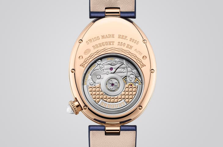 寶璣在美學之外,同樣注重機芯的精準與穩定。9935搭載537L2自動機芯,震頻3.5Hz,動力儲存約45小時;8925則配備586/1機芯,震頻3赫茲,續航38小時。兩者皆蘊含矽質擺輪游絲,具備抗磁與抗溫差的特性,確保長期穩定運作。透過背面局部透明的藍寶石底蓋,可欣賞鍍寶璣金的鉑金自動盤,上頭以手工機刻雕花刻出Petit Trianon圖案,靈感來自小提亞農宮的花園,底蓋上則鐫刻"BREGUET 250 YEARS"字樣,為這次紀念之作畫下專屬印記。