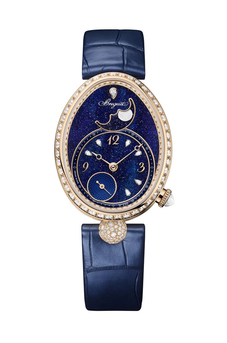Reine de Naples 9935女錶上,寶璣將月相顯示轉化為主角,讓深藍砂金石玻璃與大溪地珍珠母貝構成雙層結構。當光線流轉,其間銅屑閃耀如夜空繁星,隨佩戴者舉手之間,呈現宛如北極光的變化。以白色珍珠母貝製成的月亮柔和懸浮,微拱造型增添立體感,而月亮下方那幾乎不可見的「隱蔽簽名」,則是寶璣延續兩世紀的防偽傳統。