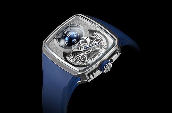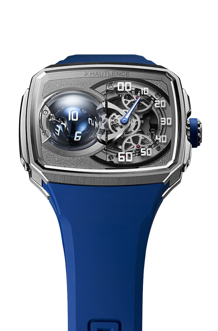 Sphere Series 1是曾得过2023年日内瓦钟表大赏(GPHG)创新突破奖的作品,它的结构和HLXX有点异曲同工的味道,面盘左半边有一颗偌大的蓝色球体,每小时透过四个锥形齿轮,围绕两根倾斜21度的交叉轴旋转,让当前小时数字可以呈现在球体的中央,光是小时显示的部分就已经够有创意,箇中牵涉的机械结构与运作模式都经过縝密设计。有别于小时显示的特殊型态,Sphere Series 1的分钟显示则为在面盘右半,利用蓝钢指针进行180度的逆跳运作,分针下方可以看到用于触动跳时的自由轮和蜗形轮,佩戴者甚至可以观察指针逆跳瞬间,齿轮传动装置是如何导引指针跳动的动态。