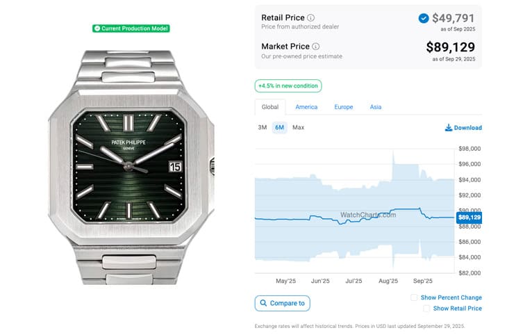 目前出现在二级市场的Cubitus系列作品还不算多,根据高级手表市场调查研究机构WatchCharts的资料,系列中询问度较高的作品如钢壳绿面5821/1A-001和铂金复杂款5822P-001大概都是2025年1月后才慢慢进入到二级市场开始有比较广泛的报价资料,其中5821/1A-001今年4月的国外市场报价为89,126美金(约合台币271万5),而5822P-001则是135,566美金(约合台币413万),这完全不会让人感到意外,因为那时还算是手表新出不久的蜜月期,行情肯定高于定价一截。