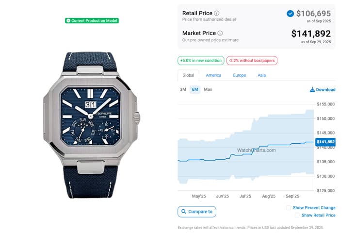 来到六个月后的现在、距离W&W表展也结束一阵子的时期,两款Cubitus系列人气作这期间的价格走势各有发展,从WatchCharts的观察可知,两款表都是刚进入二级市场时行情很高,然后从2024年底到2025年后身价一路下修,其中5821/1A-001进入2025年4月后价格大致就守在8万8千美金那条线以上,进入到9月初时曾略涨一波但很快就又跌下来,最新的报价来到89,129美金(约合台币271万6);反观5822P-001也是2025年第一季行情直直落,但从5月迄今后,身价开始逐月上升,现在差不多又回到2024年12月那时的水准,报价为141,892美金(约合台币432万3)。