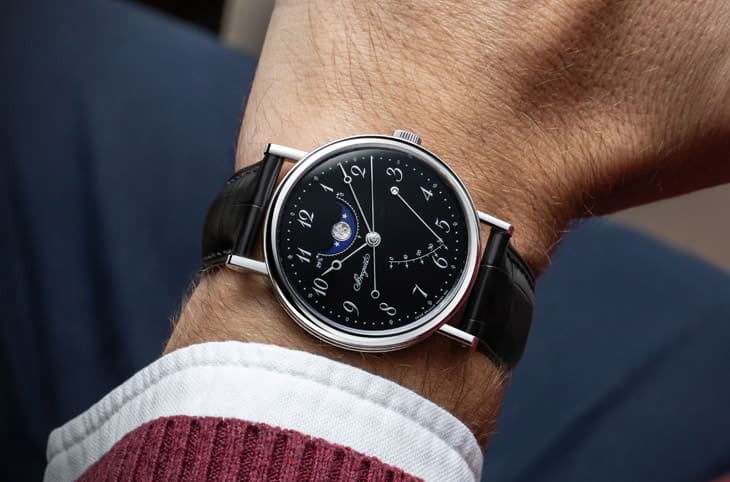 要谈「古典美」与「创新工艺」并存的时计,BREGUET Classique 7787绝对是一个经典范例,作为宝璣Classique系列的一员,它完整继承了创办人Abraham-Louis Breguet对时计的美学哲学:清晰易读、纯粹优雅、结合技术与艺术。7787的设计灵感甚至可追溯到1790年代的No.5怀表,那是一只诞生于法国大革命时期的作品,凭藉不对称却和谐的结构,奠定了宝璣独到的风格基础。这一次,宝璣是以铂金表壳搭配黑色「大明火」珐琅面盘问世,不仅保留了系列的庄重与古典气质,还巧妙注入了一丝现代的轻盈与趣味。对于爱表人来说,它是一款能在正装场合展现格调,同时细看之下又能发现惊喜细节的作品,佩戴时会让人不自觉地感受到宝璣近250年来的精神延续。