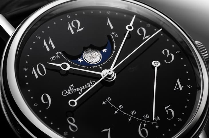 ▲深黑色大明火珐琅面盘,衬托银色数字与宝璣指针,月相与动力储存显示诗意盎然,搭配趣味分钟刻度,增添艺术魅力。