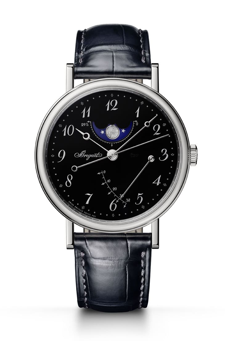 黑色「大明火」珐琅面盘,犹如Classique 7787的灵魂,珐琅工艺讲究极高的精度与耐心,每一次烧制都可能因裂痕或气泡而报废,成功完成的成品,能呈现深邃、均匀且历久不衰的光泽,黑色珐琅的质感如同夜空,静謐却蕴藏无限想像。宝璣式的阿拉伯数字以银粉印制在黑色珐琅上,带有细致的颗粒感,读时清晰却不失优雅。搭配同样镀銠的镂空「月形」宝璣指针,简洁中见细腻,面盘上还安排了两个实用而富趣味的功能:5点半方向的动力储存显示,以弧形刻度和指针展现出微妙的「不对称美」;12点钟位置的月相显示则堪称全场焦点,金质月亮与银色星辰点缀于蓝色夜空,随时间推移展现盈亏变化。更特别的是分钟刻度设计。除了菱形与六角星的组合,还在部分5分钟刻度处放上独特符号,有人说像复古电玩图示,也有人认为是百合花的变形,不管如何解读,这些「小惊喜」都在严谨的古典面盘上添了一份俏皮,让手表多了几分亲和力。