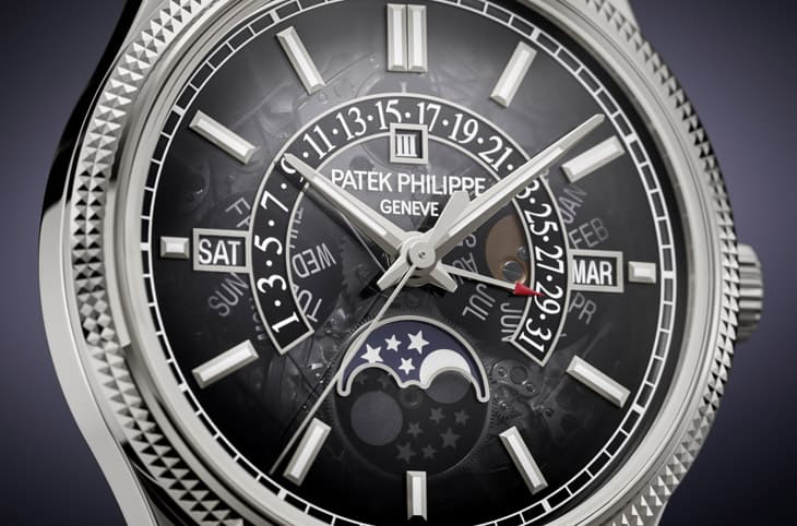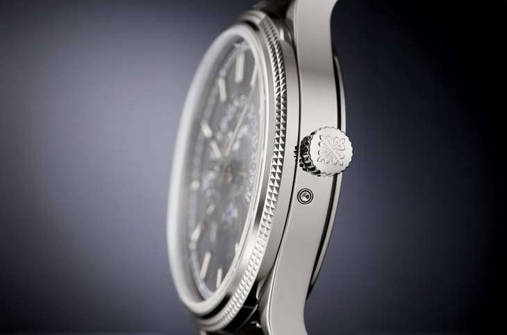 ▲白金表壳搭配巴黎钉纹饰纹,烘托整体的优雅比例,透过这种细致机刻纹理提升层次,结合拋光处理营造典雅气息,充分展现百达翡丽对工艺与细节的坚持。