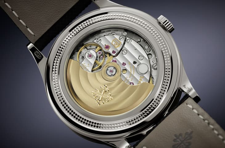 26-330 S QR这枚自动上链机芯能同时承担万年历与逆跳日期的双重挑战,并保持极佳的可靠性。在面盘侧,9点钟方向是星期、3点钟方向是月份,12点钟方向则显示闰年,6点钟方向则安放了极精准的月相。逆跳日期指针并不是绕圈前行,而是在月底时会瞬间「跳回」每月1日,过程俐落乾脆,这套设计使用了螺旋弹簧机制,确保了指针动作的乾净俐落,也避免了额外消耗能量,展现出百达翡丽对细节的执着。月相显示的误差控制在122年才需校正一天,这种超过表主「一辈子」的精度,几乎保证了佩戴者在一生中无需手动调整,加上每小时28,800次的震频与百达翡丽印记严格规范的日差标准,这枚机芯在稳定性与美感上可谓双全,而虽然45小时动力以现今标准并不算长,但对多数收藏家这样的细节并不影响吸引力,毕竟,透过透明底盖欣赏21K金自动盘与桥板打磨,才是这款机芯最迷人的日常仪式感。