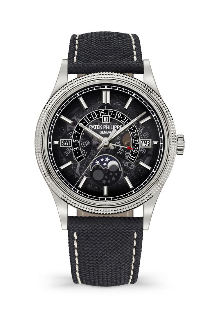 6159G最容易吸引目光的莫过于那片烟燻蓝宝石面盘,它的半透明质感像是打开了一扇小窗,让人得以窥见机芯的律动,但又不至于完全赤裸裸地暴露所有细节,边缘自灰蓝色逐渐过渡到黑色,形成渐变的深邃感,这种处理方式不仅让面盘更具立体感,也营造出一种神祕氛围。不同于朗格的Lumen系列直接大方展示整体结构,百达翡丽的处理手法更收敛,让人感受到机械的复杂度,又保留了含蓄与格调,时针、分针与时标上均涂有夜光涂层,即使在昏暗光线下,读时依然清晰。加上星期、月份、闰年与月相的显示窗,细节被白金边框圈起,让面盘更显立体与精致,对于收藏家而言,这样的「X光美学」不仅可以提升辨识度,也象徵品牌愿意用创新的思维去诠释经典复杂功能。