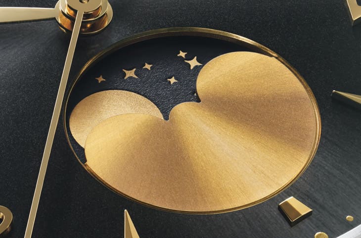 ▲6点钟方向的月相显示是整只表的灵魂,透过描绘星空的旋转圆盘,动态呈现月亮盈亏过程,诗意十足,赋予手表浪漫氛围。