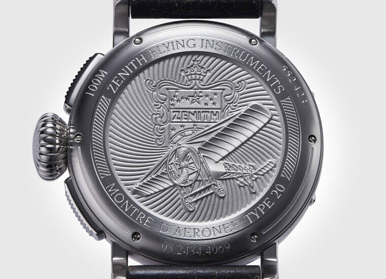 Pilot Type 20 Rescue搭載的Elite機芯(大三針)和El Primero機芯(計時碼錶)震頻分別為28,800次/小時和36,000次/小時,動力儲存則同樣為50小時,而雖然它們都是飛行錶,可是真力時也特地確保其防水性能可以達到100米的水準。手錶底蓋均刻印上了法國航空先驅Louis Blériot在1909年佩戴真力時手錶飛越英吉利海峽時搭乘的飛機圖案和真力時飛行儀器的徽章,低調彰顯出品牌與飛行錶之間的深厚淵源。
