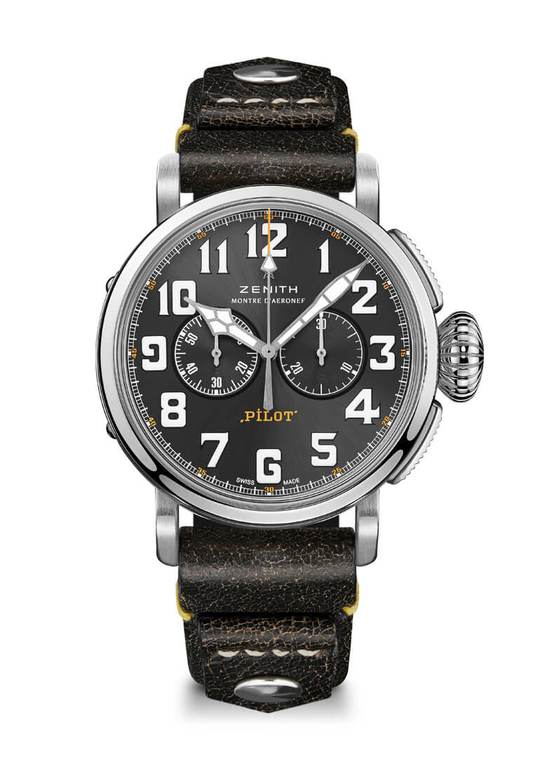 這款飛行錶面盤還有一些值得注意的細節,如12點方向和6點方向分別印有”MONTRE D’AERONEF”與”PILOT”字樣,勾起佩戴者回憶起品牌是最早生產飛行錶的品牌之一;換句話說,這些看似不起眼的文字,其實也正說明了真力時製作飛行錶的代表性。