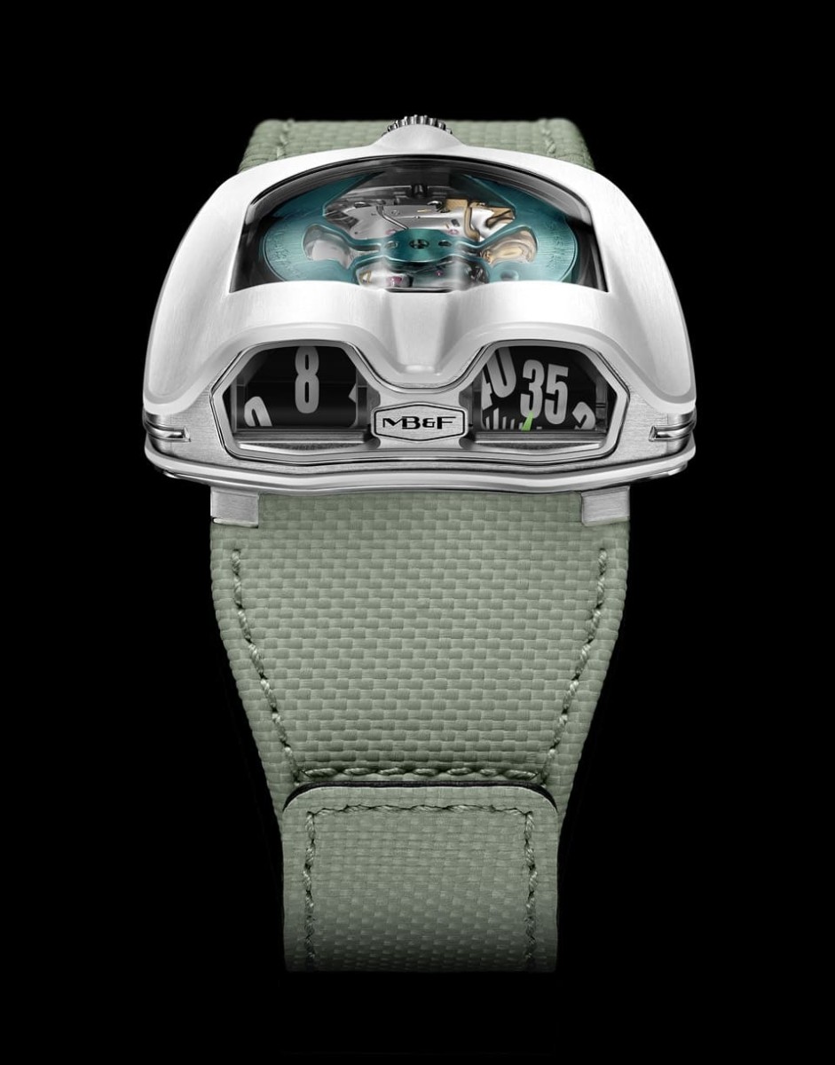 MB&F是「匠心.獨具」時間藝術展的常客,這次品牌帶來了HM8 Mark 2,其採用特殊的CarbonMacrolon?材質,並非第一眼看到以為是不鏽鋼或白金等金屬。手錶造型非常具有創意,連帶使其藍寶石水晶鏡面的製作過程難度提高。針對Mark 2版本,MB&F調整了錶冠機制,使其更好操作,也獲得更穩固的保護性,除了鈦金屬白色CarbonMacrolon?錶殼,MB&F也另外推出鈦金屬綠色CarbonMacrolon?錶殼供市場選擇。腕錶限量33只,參考價為NT$ 2,660,000。