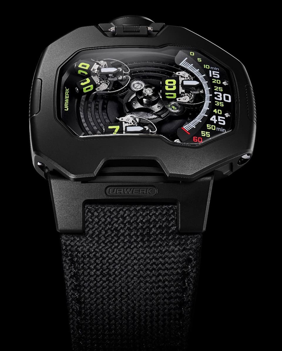 UR-120 Space Black將飛到台灣與收藏家們相見歡。這款錶採用全黑設計展現時尚酷炫型格,然而最特別的始終是開面設計面盤上的衛星轉頭系統,每一枚轉頭上都有各自代表的小時數字,這些轉頭平時是呈V字形,一旦時間運轉到了當前時刻,則該轉頭會合併形成完整的數字以顯示時間,簡單來說每逢轉換下一個小時時,手錶搭載UR-20.01機芯上的轉頭會分別進行三個層次的轉動,上演一場精彩動人的時間大戲。錶款參考價為NT$ 4,300,000。