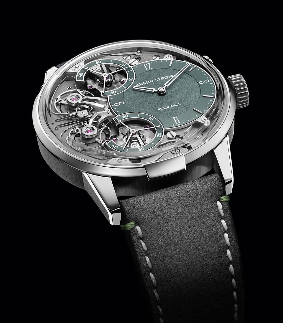 矚目作品包括Mirrored Force Resonance不鏽鋼款,錶款搭配綠色Grenage紋理面盤和灰色Alcantara人造麂皮錶帶,這款錶特色在於蘊含兩套擒縱系統彼此合作,藉以提升手錶的走時精準度,且機芯都標榜經過二次手工組裝,確保品質值得信賴。Mirrored Force Resonance不鏽鋼款限量50只,參考價為NT$ 2,530,000。