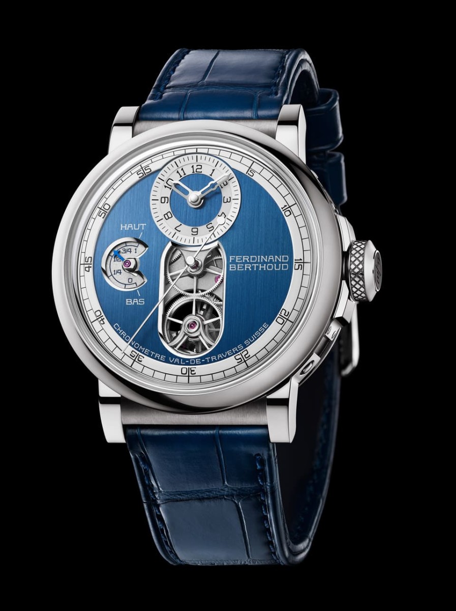 Chronomètre FB 2T乃是品牌將精密的FB-T.FC機芯移植進圓形錶殼內,其內部擁有罕見的「圓錐輪-芝麻鏈」恆定動力裝置,呈現於外觀上則是古典雅緻的設計,藍色面盤以緞面修飾烘托偏心時、分小錶盤與中央秒針的存在感,錶款以白金製作,搭配深藍色鱷魚錶帶相得益彰,Chronomètre FB 2T參考價為NT$ 9,250,000。